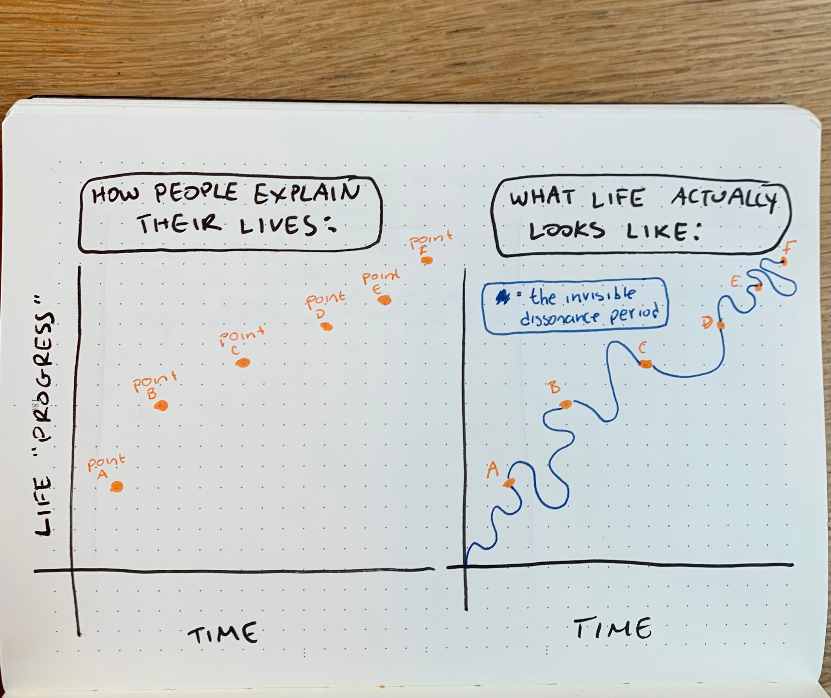 While some changes involve radical and instantaneous transformations, most changes rely on momentum building towards that next orange dot. We rarely reflect on the slow, brooding process of change, though. Once we get to the next thing, we’re focused on the next thing, not on the journey we just went on to get to where we are. We seldom hear about this part of the journey from others either, which is why we feel so alone in experiencing it. Instead, we hear their over-simplified summary—point A to point B, as if there’s a time vacuum between the two. But beneath these pronounced changes are pathways of dissonance connecting one phase to the next.