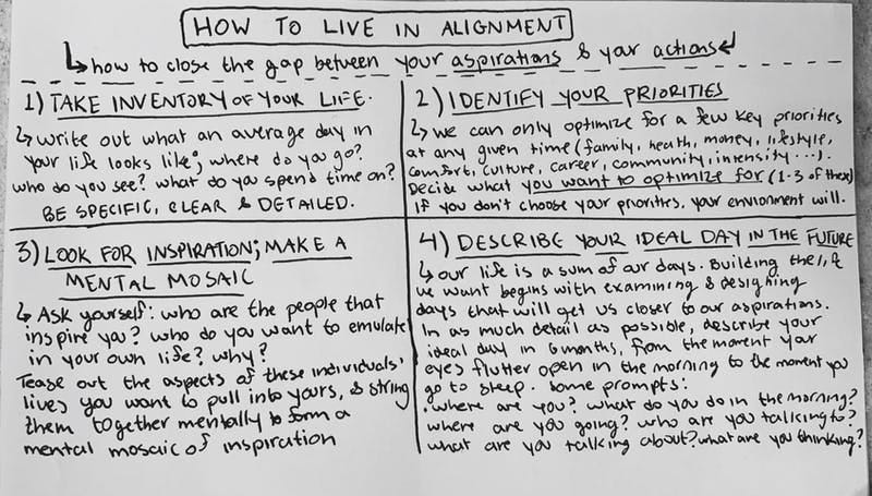 By (1) defining our aim, (2) outlining our priorities, (3) drawing inspiration from those we look up to, and (4) designing our ideal future day, we can close the gap between what we want to be doing and what we are doing, moving closer to alignment, one day at a time. If we put enough days of doing this in a row, we will eventually meet ourselves in the vision we created, living out our ideal day in reality. And it is precisely at that moment — when our actions meet our aspirations — that we are living in alignment.