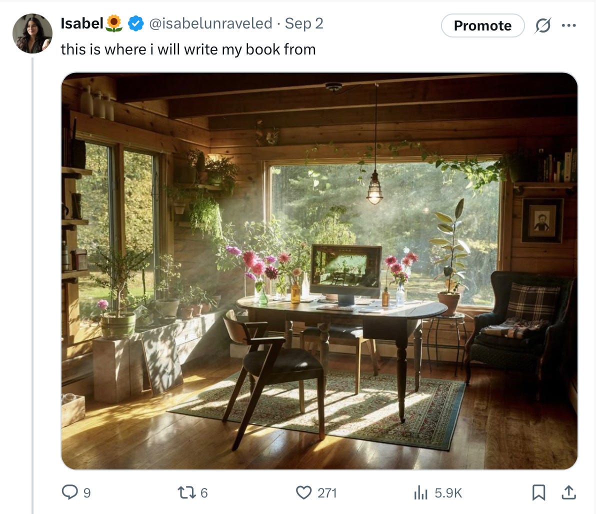 A few days later, I found myself writing at the table you saw in the header image of this essay, which felt about as close as I could have come to this picture above with no effort at all. It makes me wonder how much you can pull your desires towards you by simply naming and knowing what you want.